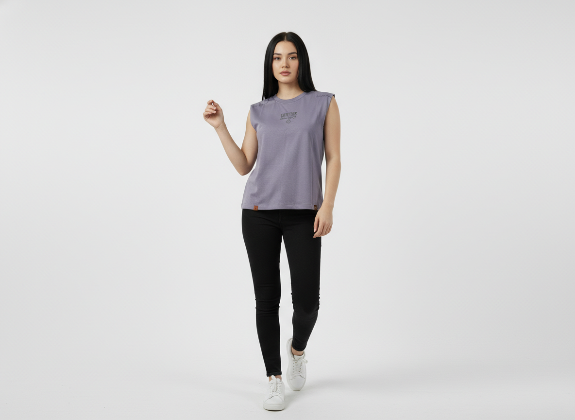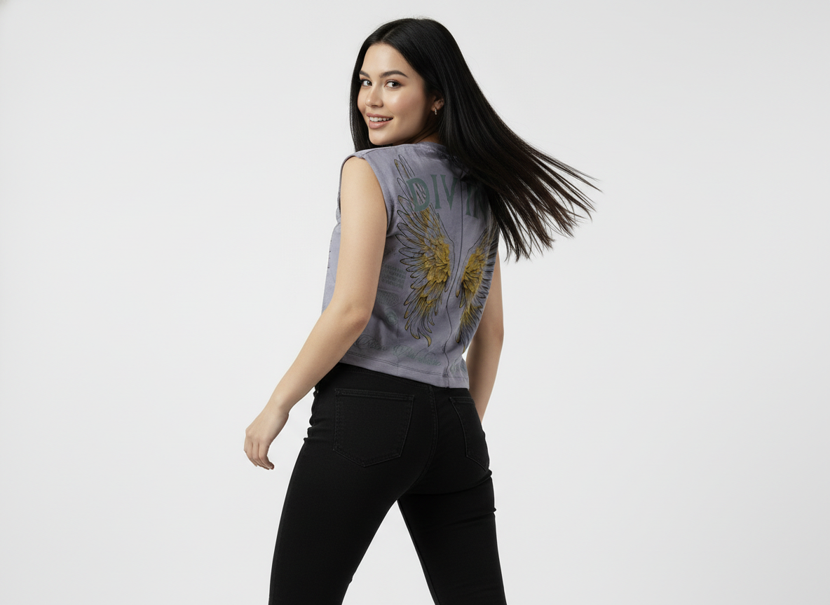 Blusa tipo camisilla para mujer en alto gramaje, inspirada en el concepto Divine, pensada para resaltar fuerza interior, luz y propósito. En la parte trasera, un letrero superior con la palabra “Divine” se despliega sobre alas extendidas, una a cada lado de la espalda, simbolizando protección, elevación y conexión con lo esencial. En la parte inferior, la frase “Rise and Shine” refuerza el mensaje de despertar, avanzar y brillar desde la intención personal.